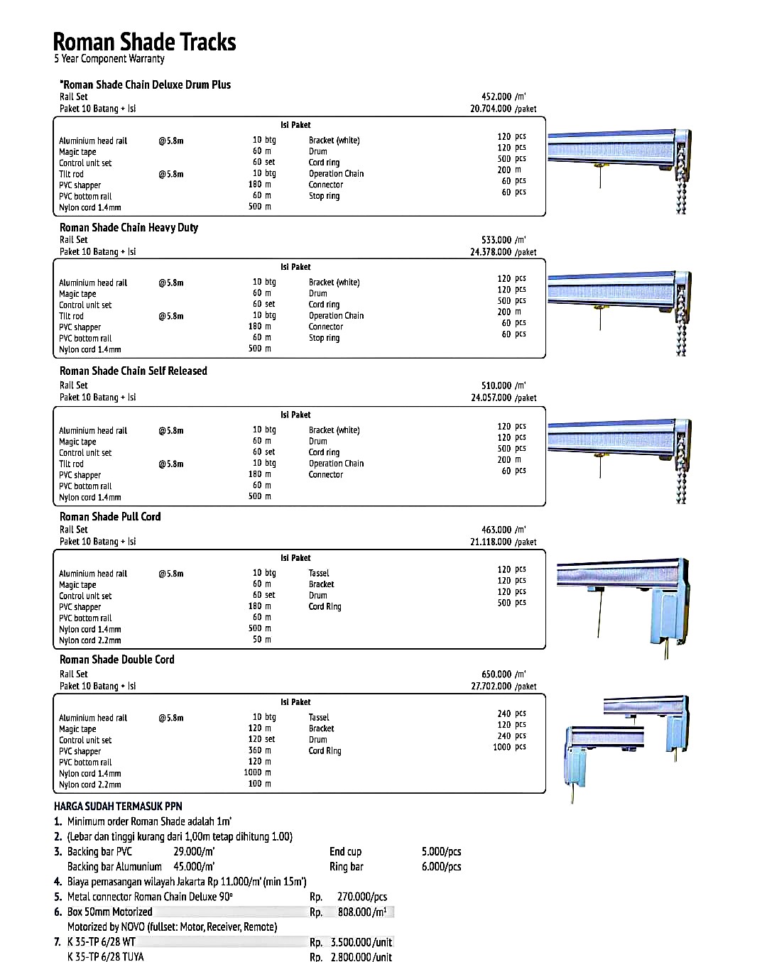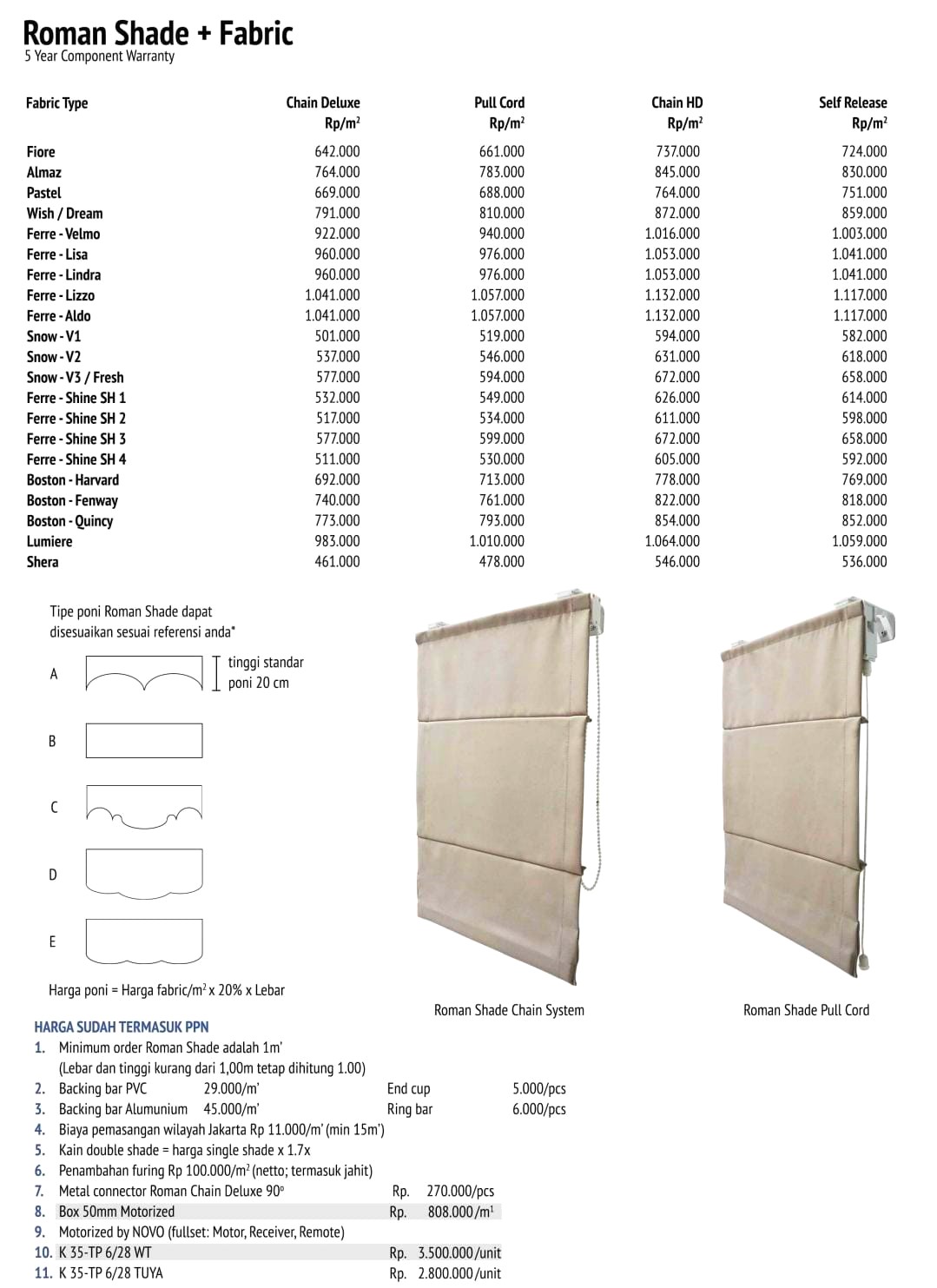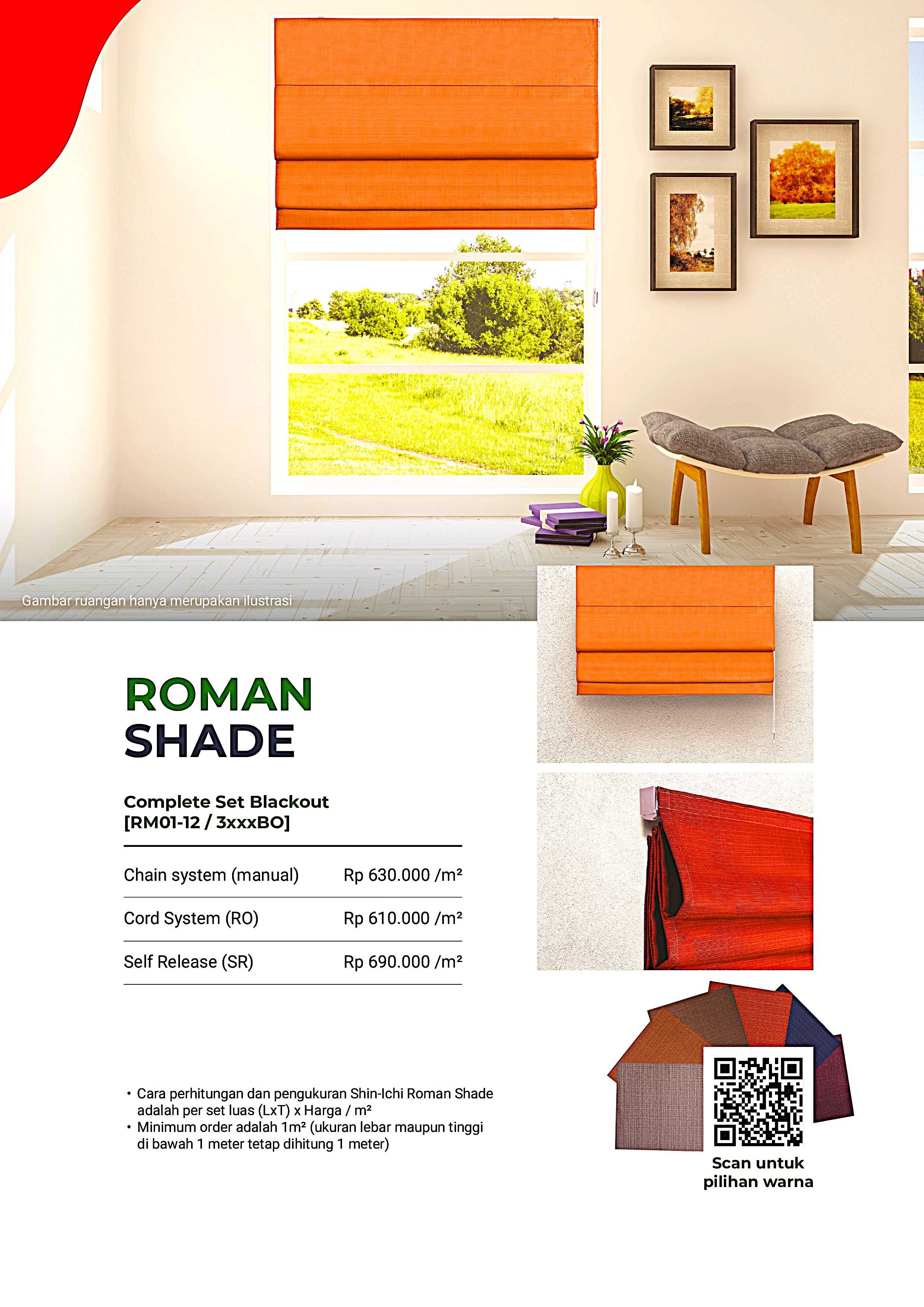 Roman Shade adalah salah satu fashion blinds yang simple, mewah dan praktis. Yang dirancang khusus dari bahan kain dengan variasi renda dan motif–motif yang indah, simple dan mewah, sangat cocok untuk jendela ruangan Anda yang modern dan minimalis.