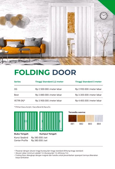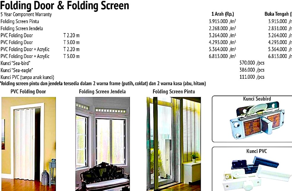 Folding door/pintu lipat & folding screen door adalah solusi yang sangat efektif ketika anda memiliki ruangan yang terbatas. Kombinasi gerakan swing dan sliding memberikan pintu masuk yang lebih besar tanpa bingkai pintu apapun.