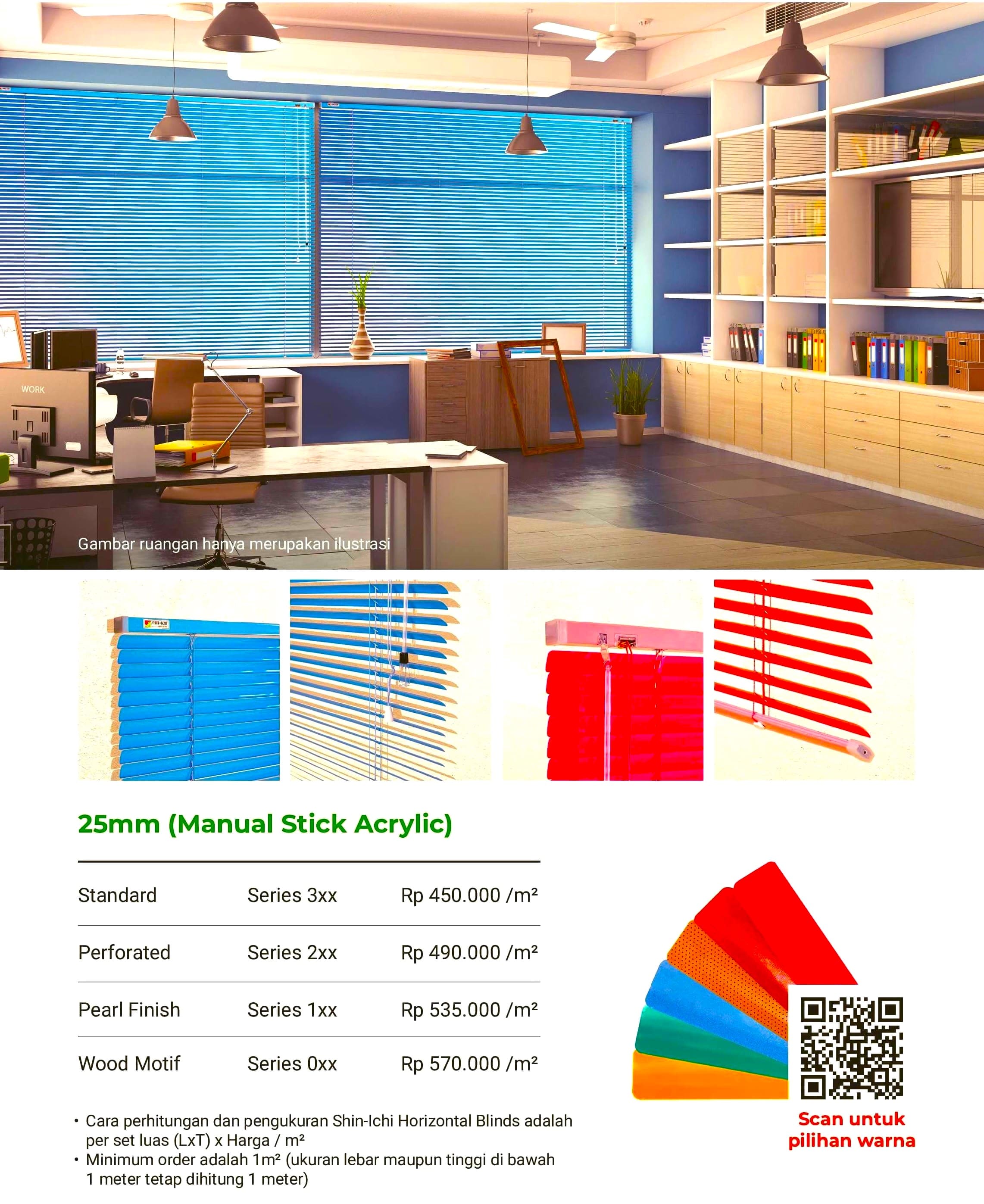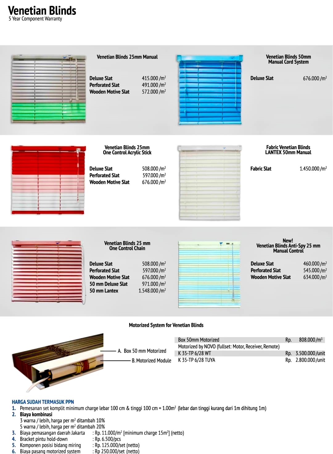 Horizontal Blinds – Venetian Blinds penutup jendela dan pengatur cahaya secara horizontal, minimalis. Berkesan mewah dengan 120 pilihan warna. Berbahan dasar slat aluminium + finishing cat yang cemerlang dan box atas dan bawah aluminium solid + powder coating. Tahan terhadap cuaca anti & anti karat seumur hidup, sewarna, penampilan lebih elegant & apik. Dengan komponen kualitas terbaik ( bergaransi 1 tahun ). Tersedia dalam beberapa sistem pengoperasian : – Manual system – One control system – Pull Cord System