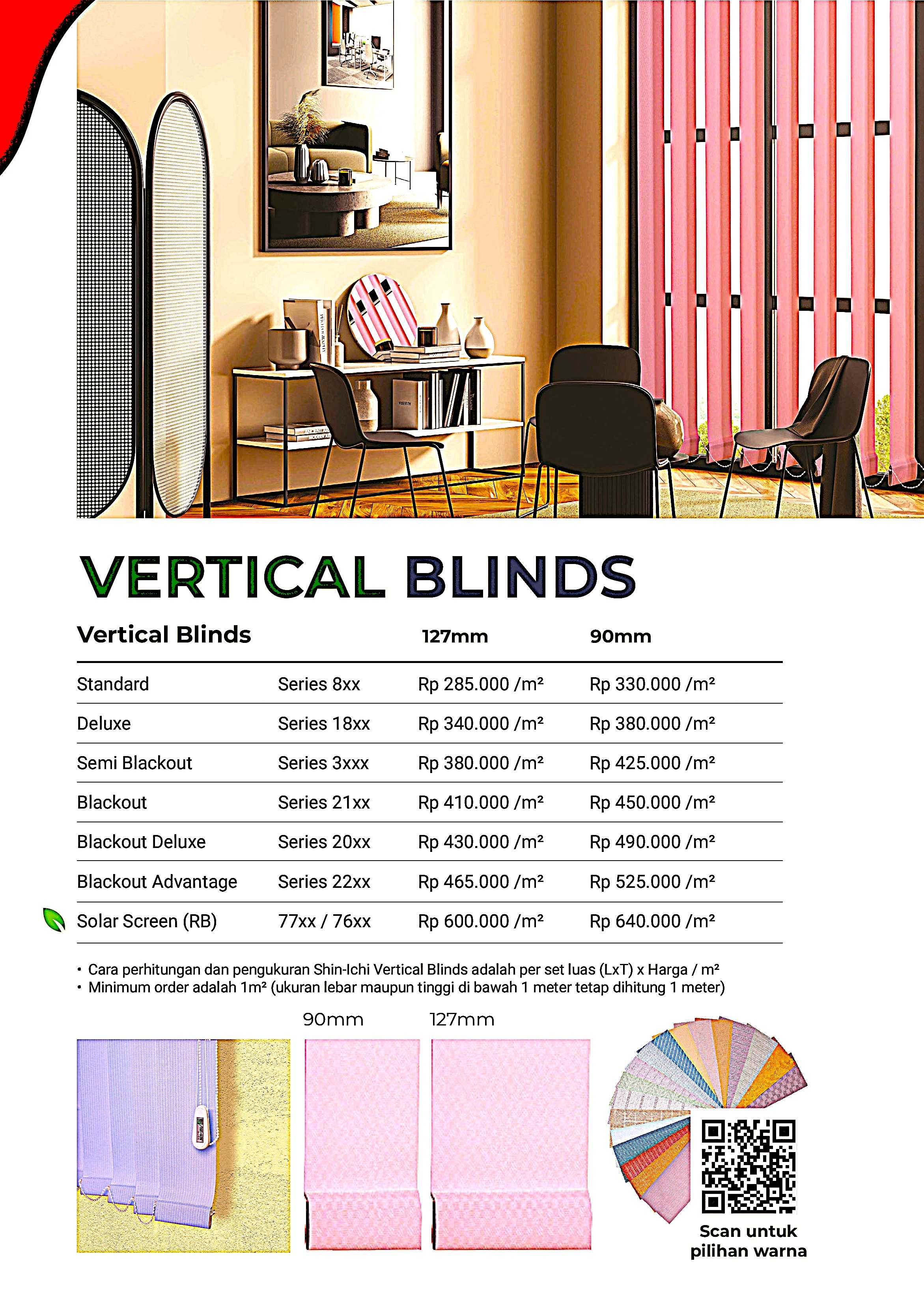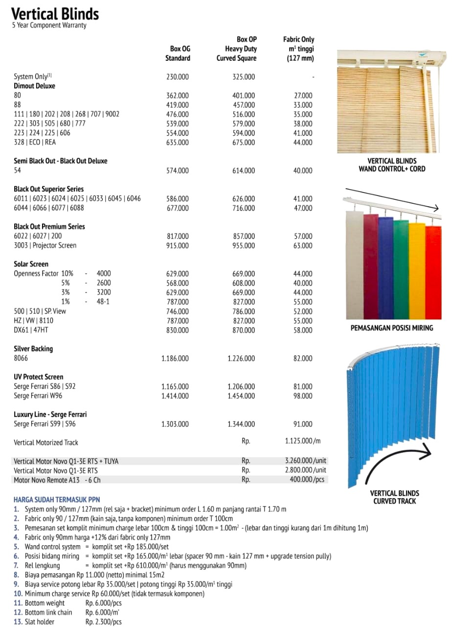 Adalah tirai jendela dengan pengatur cahaya/sinar matahari secara vertical. Material komponen dari plastik, nylon & metal crome, (bukan bahan daur ulang). Track/ box atas almunium solid + cat powder coating, lebih tebal, sangat lancar pada saat pengoperasian, tidak berisik dan anti macet. Fabric/kain terbuat dari bahan Polyester/Fiber glass dilapis dengan bahan khusus, dengan teknologi yang sempurna sehingga tidak melengkung dan tahan terhadap cuaca. Vertical blinds dapat di aplikasikan pada penggunaan gorden rumah maupun gorden kantor.